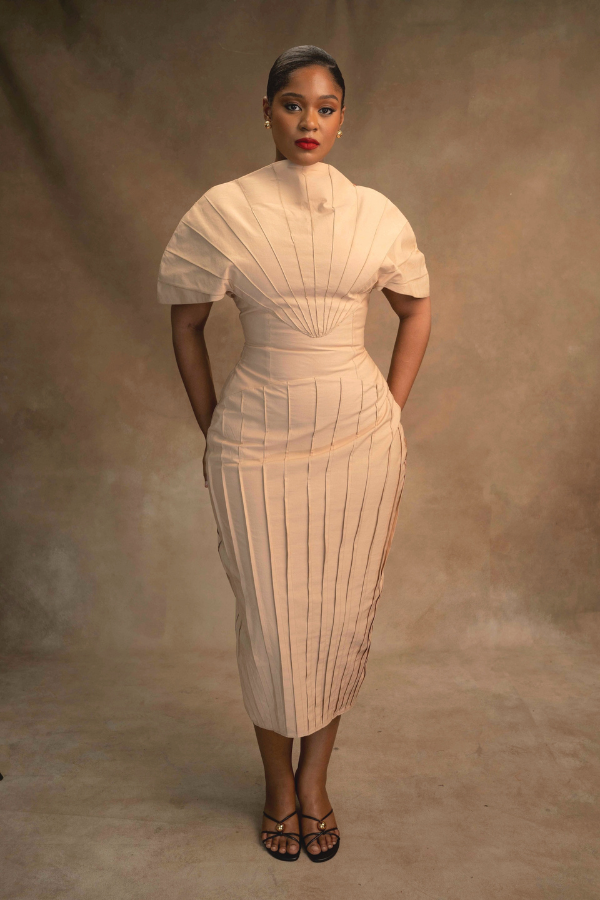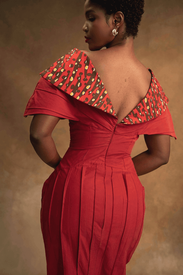 A masterclass in structural tailoring, the Akorfa Dress balances severe, clean lines with an unexpected, cultural touch. Designed for a commanding presence from every angle.