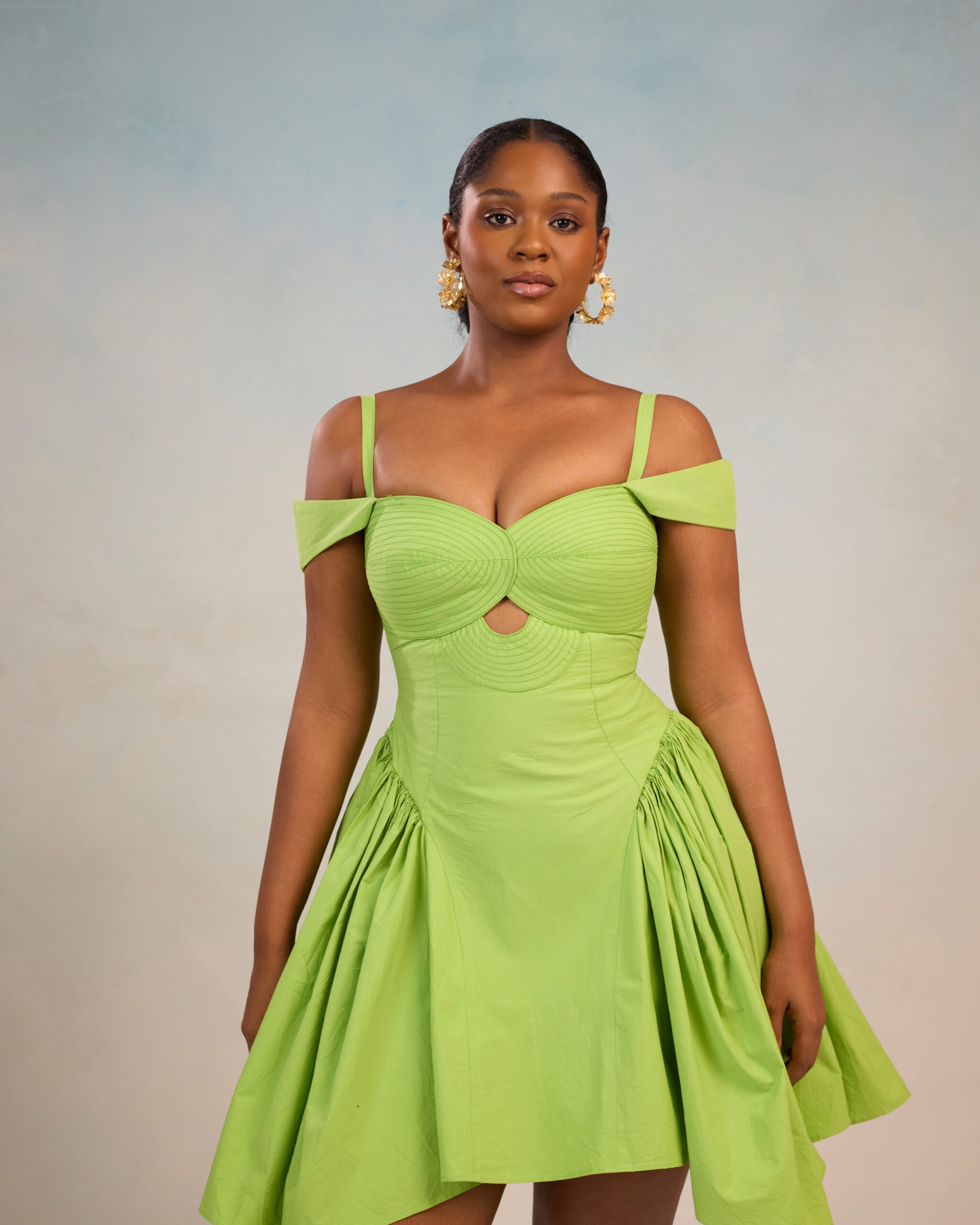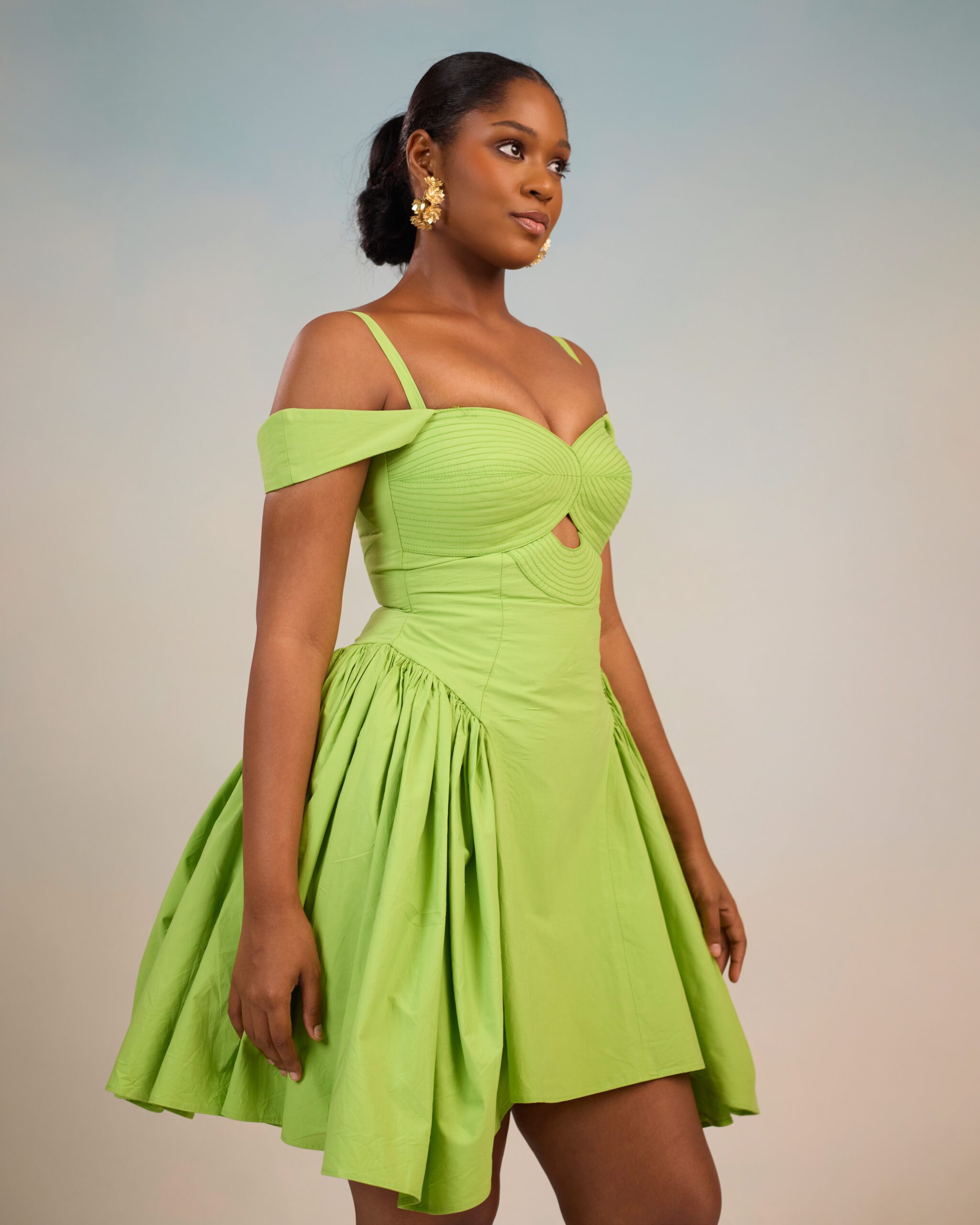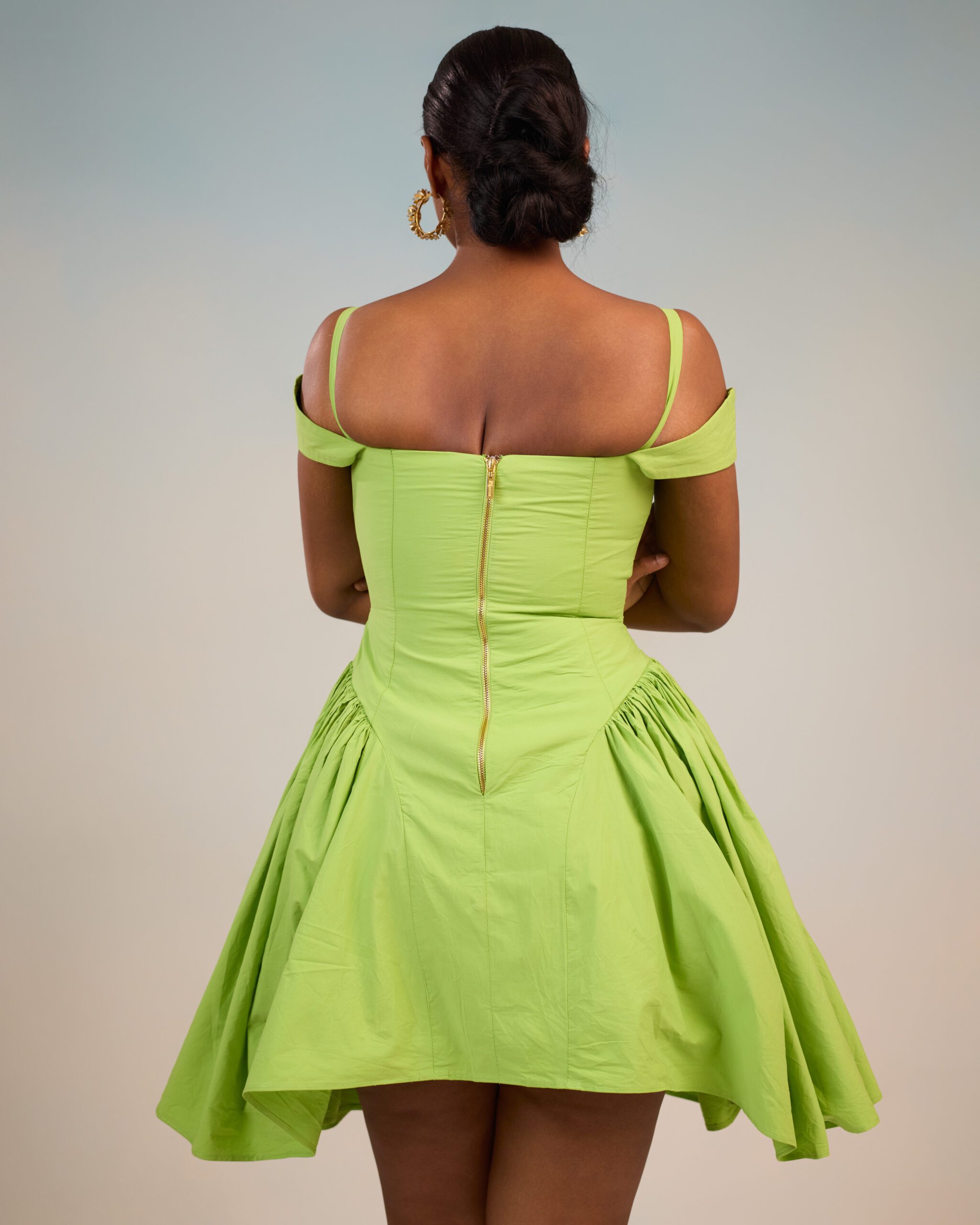 Vibrant green structured mini dress crafted from crisp cotton sateen. The Amiee Dress features an off-shoulder and strap combination neckline, sculpted bust seams, and a small cut-out detail at the center front. Designed with a defined waistline that flares into a full circular skirt.
