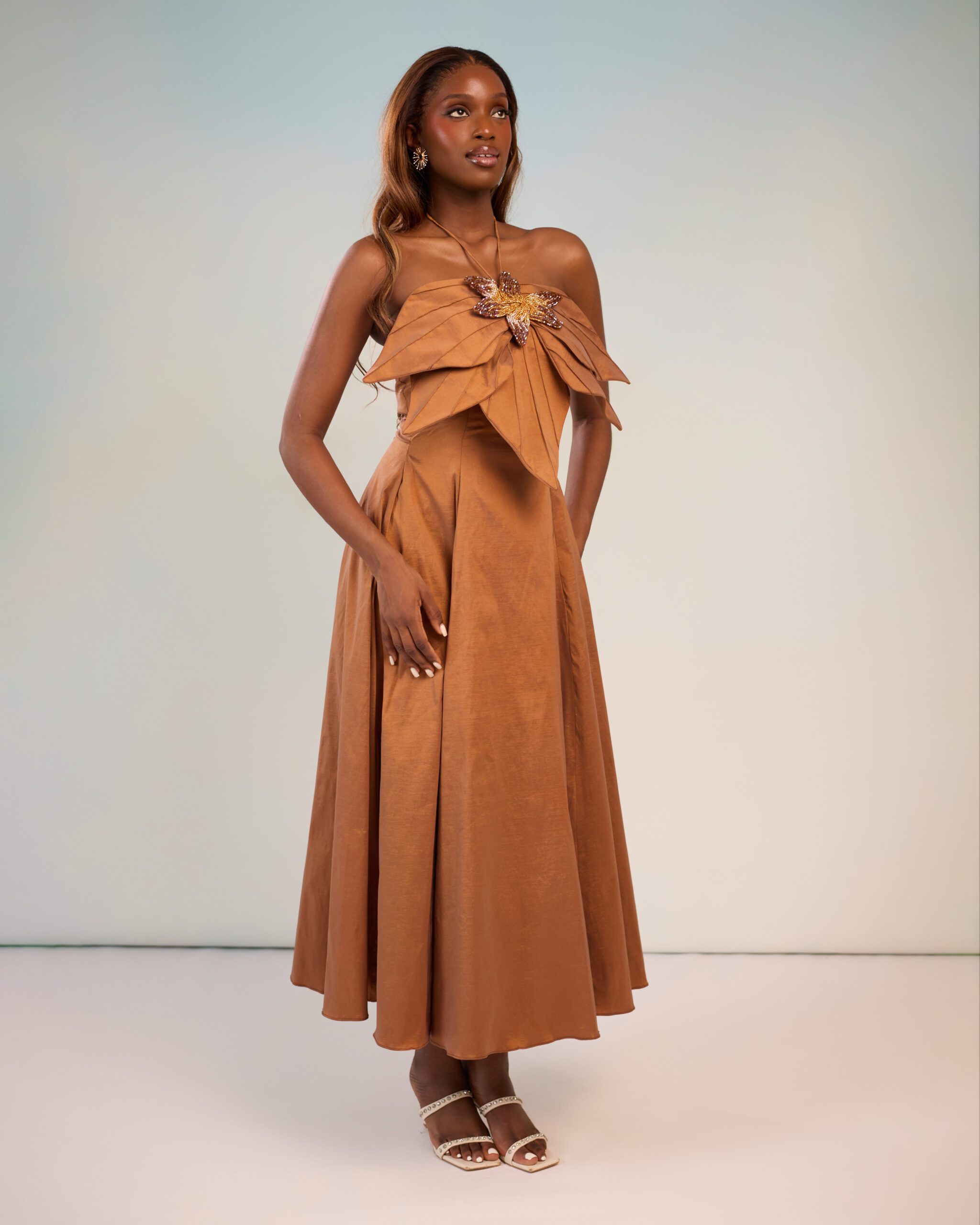 Halter midi dress with a layered floral neckline and flared skirt with defined waist and hand beaded floral broach