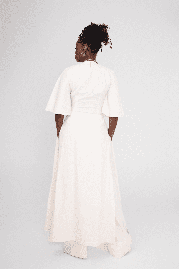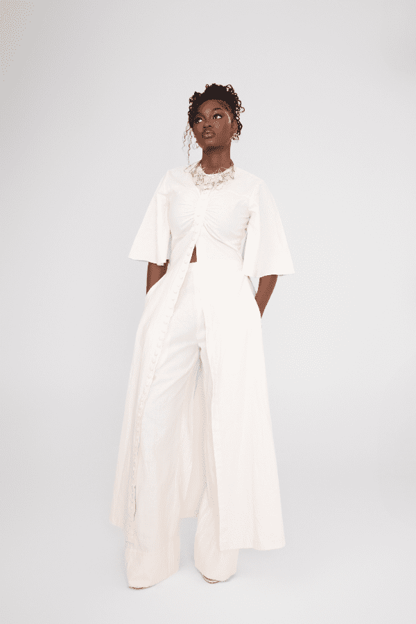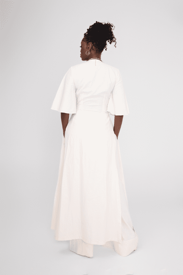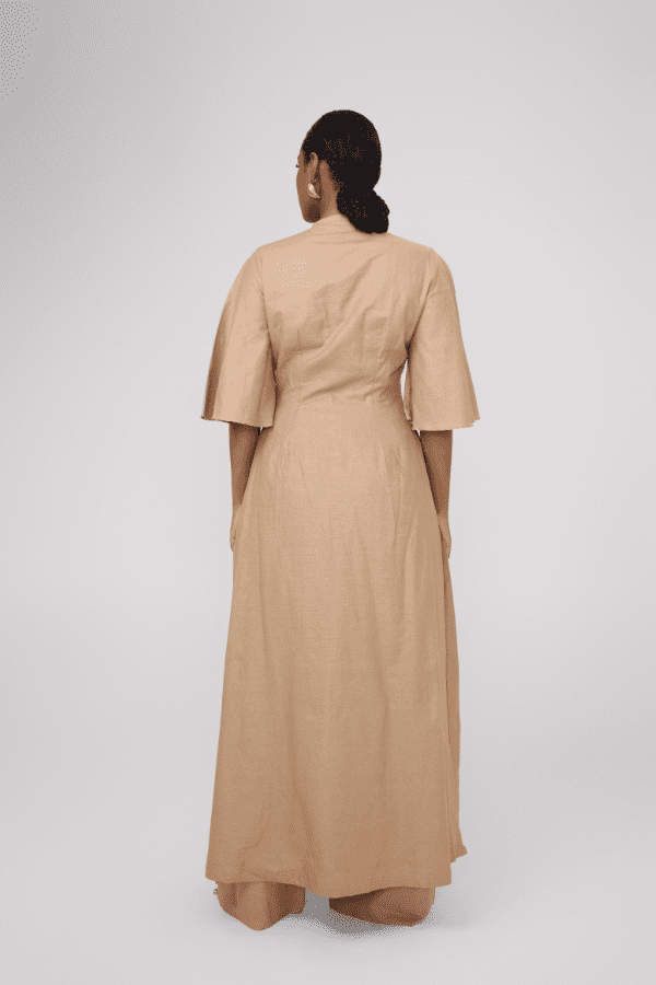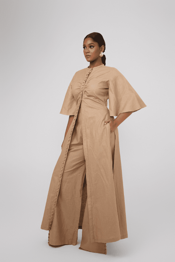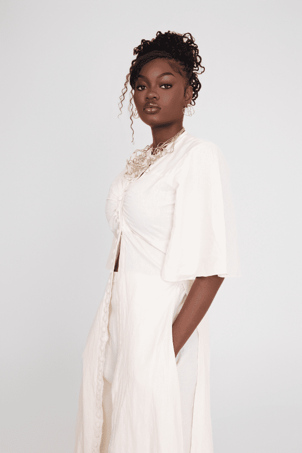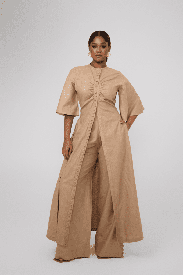 The Zuri Set is crafted from lightweight linen, available in both white and tan. It features button details on both the tailored top and the wide-leg pants, combining a structured yet breathable design. The set exudes a clean and refined aesthetic, perfect for versatile styling.